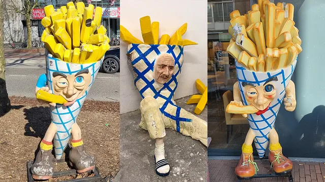 Hij staat vaak voor de deur van een snackbar: een blauw met wit geruite puntzak met handen en voeten die al knipogend een hapje van een frietje neemt. Maar kijk je eens goed, dan zie je hoe grimmig hij er eigenlijk uitziet. Hij heeft wallen onder zijn ogen, een wazige blik en het frietje hangt als een joint in zijn mondhoek.