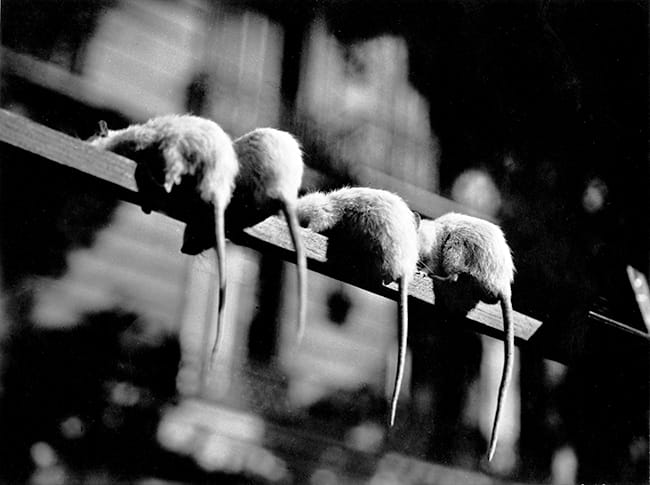 ‘In haar werk zit absoluut een soort zwarte humor. Dat zat ook in Man Rays werk. Dus het is de vraag wie van welke invloed was. Een bekende en hele typische foto voor Miller is de foto waarop allemaal rattenstaarten naar beneden hangen. Dit heeft wel iets surrealistisch, maar is meer documentaire en registrerend van aard. Voor mij is dat het verschil tussen een foto nemen en er een maken. Zij legde stukjes uit de werkelijkheid vast en Man Ray creëerde zijn werkelijkheid.’